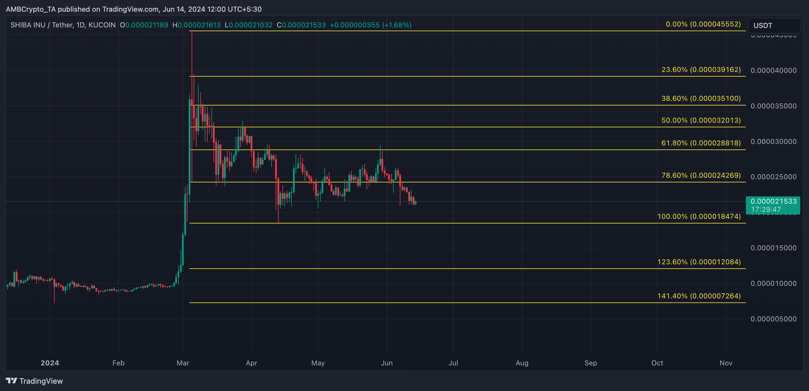 - If demand continues to stall, SHIB’s price may fall below $0.00002.’