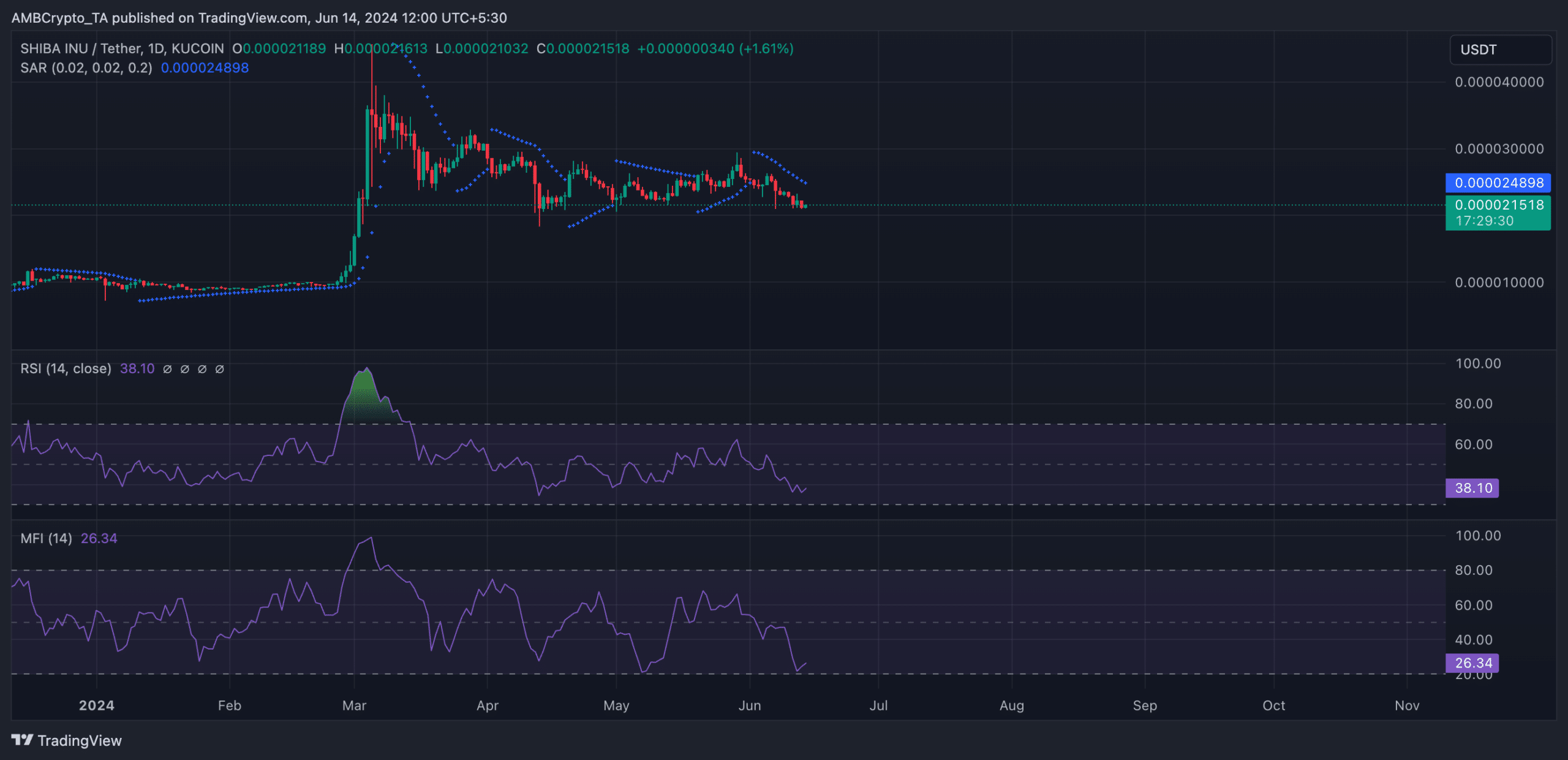 AMBCrypto assessed the coin’s performance on a daily chart and found a spike in SHIB distribution among market participants. For example, its Relative Strength Index and Money Flow Index (MFI) trended downward at press time.