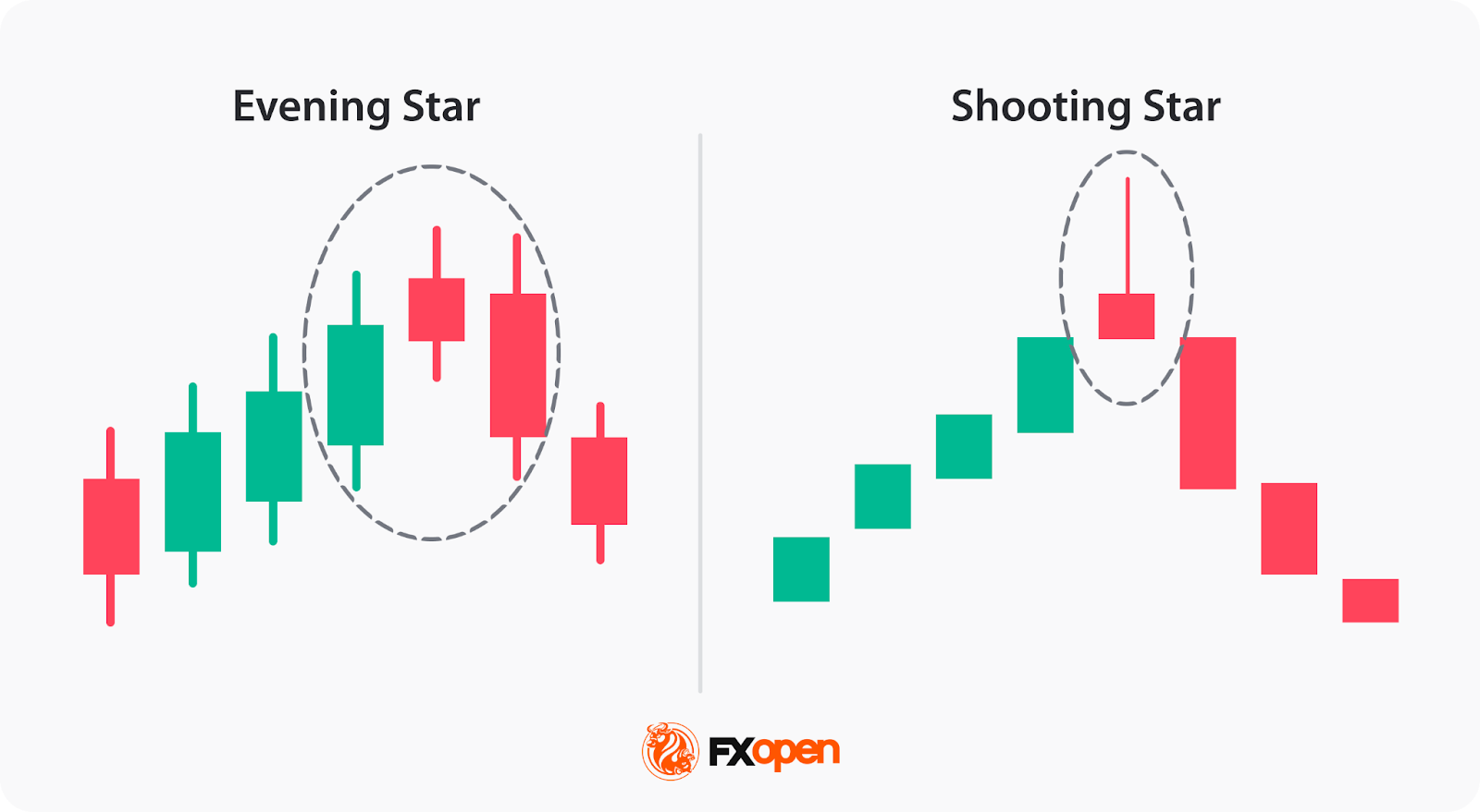 Both formations signal an uptrend reversal; however, the shooting star is a single-candle setup, whereas the evening star consists of three candles, including a large bullish candle, a small-bodied candle, and a large bearish candle.