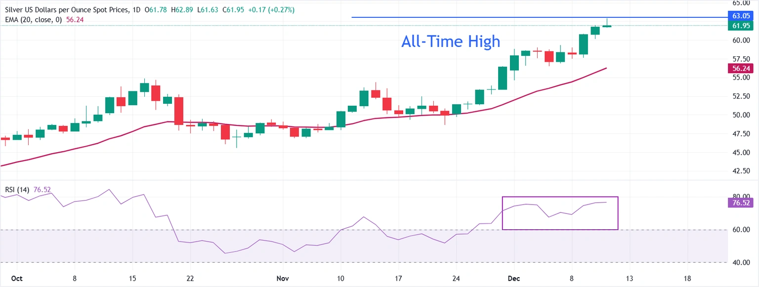 XAG/USD trades higher at $62.00 during Thursday’s Asian trading hours. The 20-day Exponential Moving Average (EMA) climbs to $56.24, underscoring a firm uptrend with price comfortably above trend support. The 20-day EMA has steepened in recent sessions, reinforcing bullish control.
