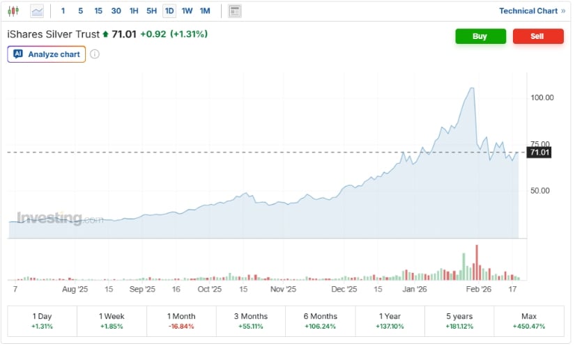 Investing.com shows SLV is trading at approximately $71, with the 6-month and 1-year returns being promising despite the recent volatility and the withdrawal of highs.