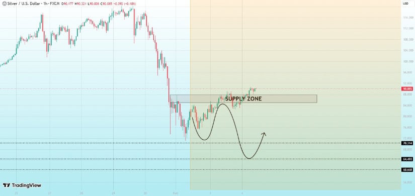 Despite the rebound, silver remains under pressure relative to gold, with elevated real yields and slowing global growth weighing on speculative positioning. Recent selloffs erased prior demand zones, concentrating liquidity at lower levels. Key downside magnets include $70.30, $64.40, and $60.60 if risk sentiment deteriorates.