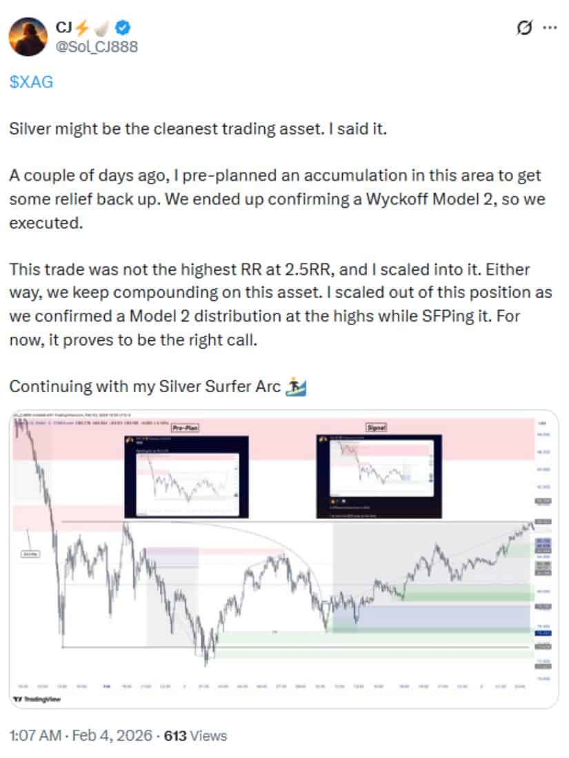 Silver was traded cleanly through a planned Wyckoff Model 2 accumulation, with scaled entries and a timely exit as distribution signals appeared. Source: CJ via X