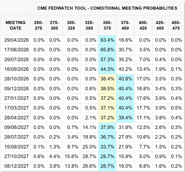 According to the CME FedWatch tool, markets continue to price a delayed and gradual easing cycle, with the highest probabilities centered around the 350–400 bps range through 2026, and only a slow progression towards lower rates into 2027. This reinforces the view that near-term rate relief is limited, and higher-for-longer conditions may persist.