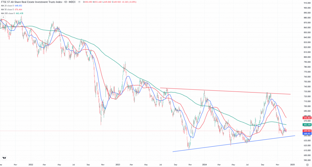 FTSE ST Real Estate Investment Trusts (FTSE ST REIT Index) decreased from 649.94 to 642.87 (-1.09%) compared to last month’s update. Singapore REITs index is currently trading near the support level of a wedge pattern.
