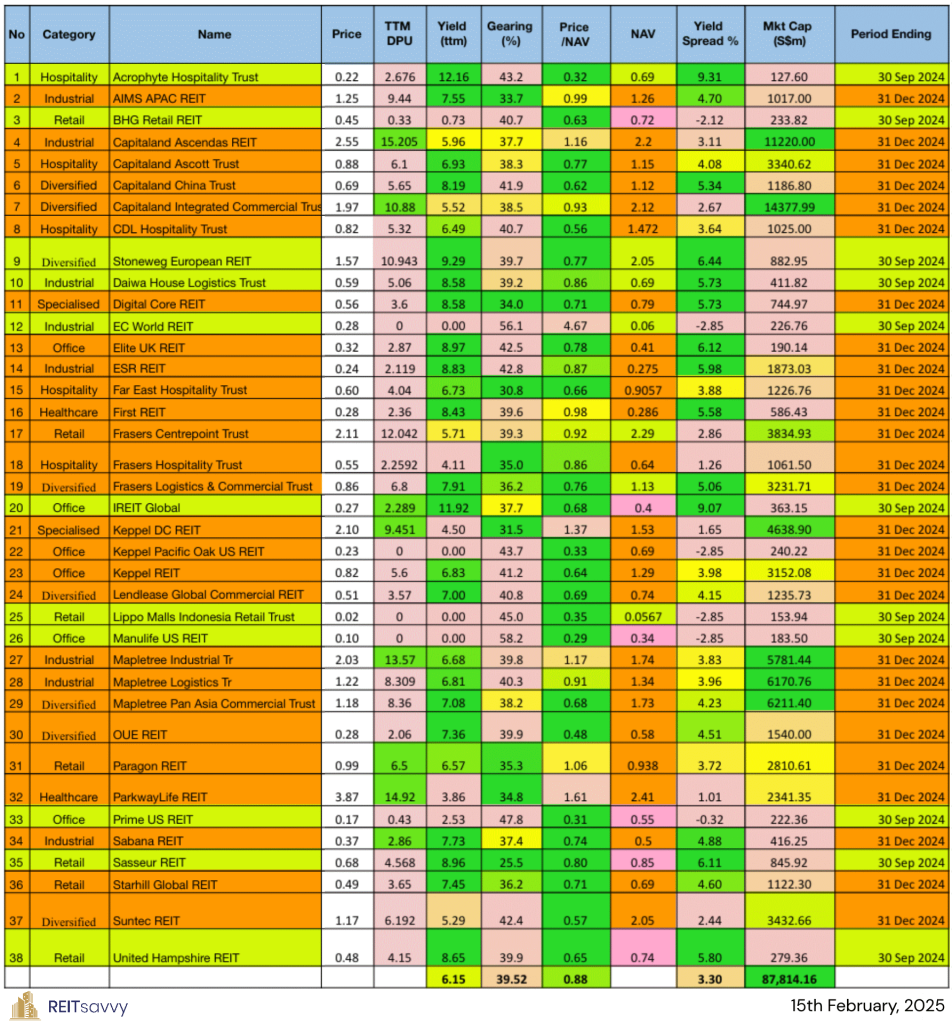 The following is the compilation of 38 Singapore REITs with colour-coding of the Distribution Yield, Gearing Ratio and Price to NAV Ratio.