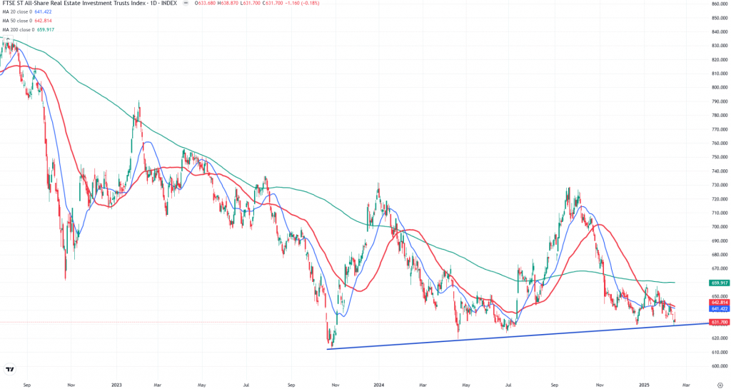 FTSE ST Real Estate Investment Trusts (FTSE ST REIT Index) decreased from 647.67 to 631.70 (-2.47%) compared to last month’s update. Singapore REITs index is trading sideway near the support level.
