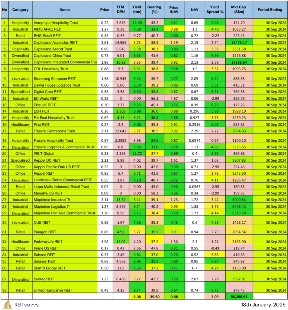 The following is the compilation of 38 Singapore REITs with colour-coding of the Distribution Yield, Gearing Ratio and Price to NAV Ratio.