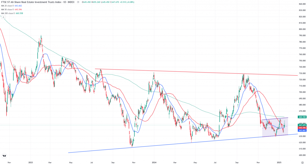 FTSE ST Real Estate Investment Trusts (FTSE ST REIT Index) decreased from 642.87 to 647.67 (0.75%) compared to last month’s update. Singapore REITs index is currently forming an inverted head and shoulders chart pattern, trading near the support level of a big wedge pattern.
