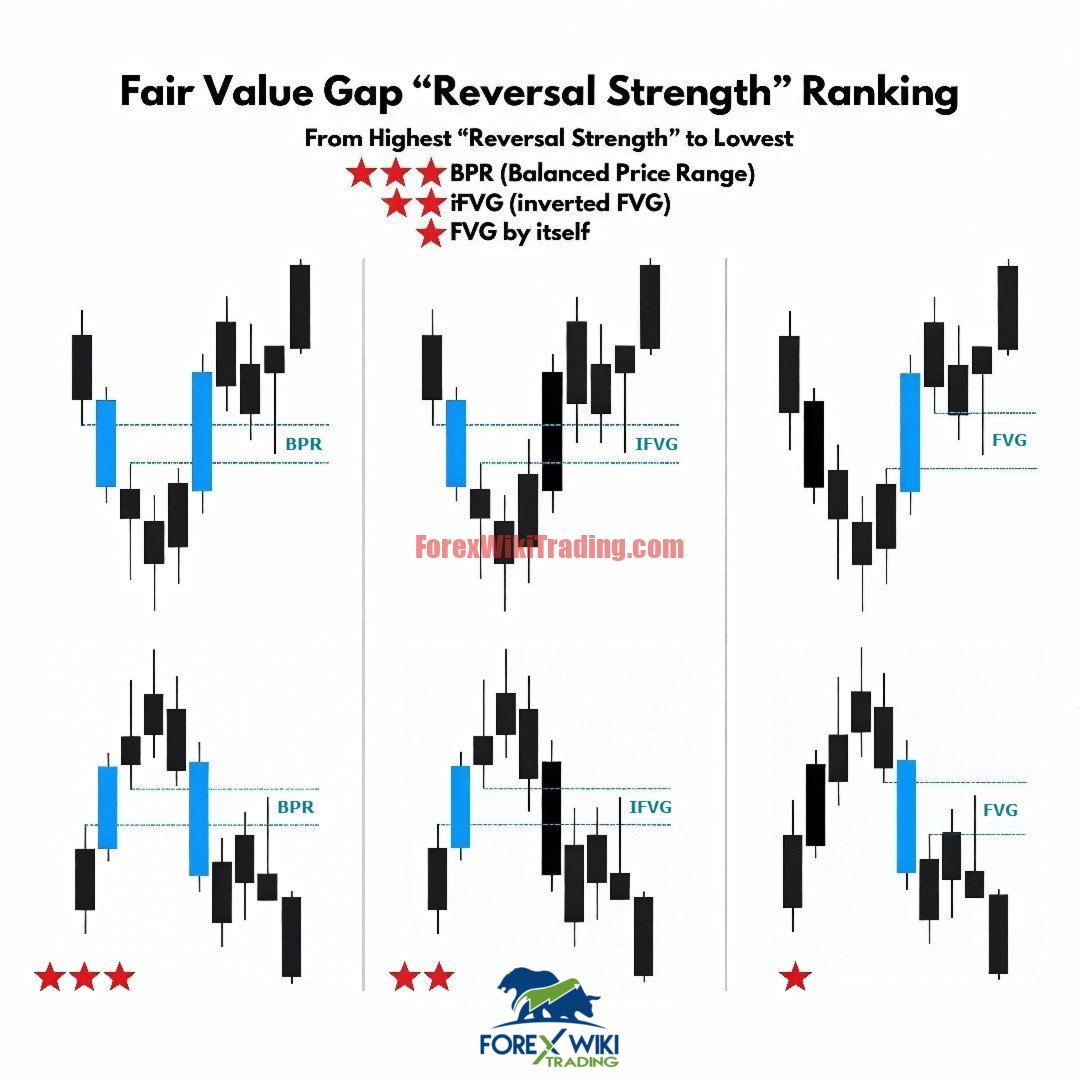 Fair Value Gap (FVG): A 3-candle sequence where the wicks of the first and third candles fail to overlap, creating a “volume void.” Price often retraces to fill this gap.