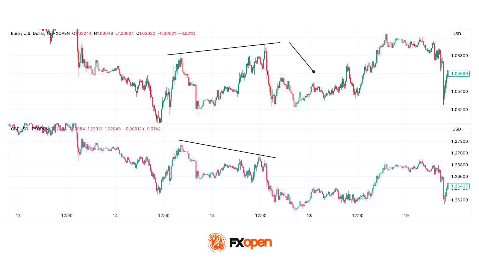 A similar principle applies in downtrends: divergence at a fresh low, where one instrument breaks lower while the other doesn’t, could signal that bearish momentum is losing steam. Traders often use these moments to reassess their analysis and consider the possibility of a reversal or pullback within the trend.