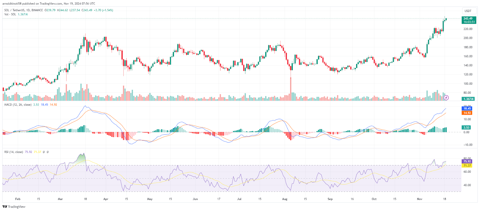 Solana’s rally has broken through key resistance levels, backed by trading volumes exceeding 515,000. Technical indicators point to sustained bullish momentum. The MACD shows ongoing upward pressure, while the RSI remains elevated at 76, signaling an overbought condition. Despite this, the positive market sentiment suggests room for further gains.