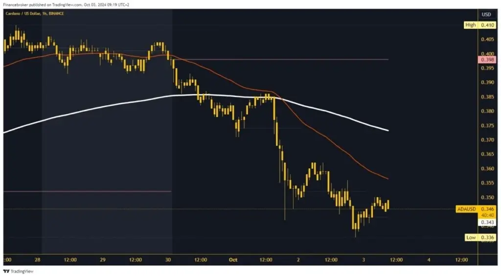 - The new weekly low price of Cardano was formed last night at the 0.336 level