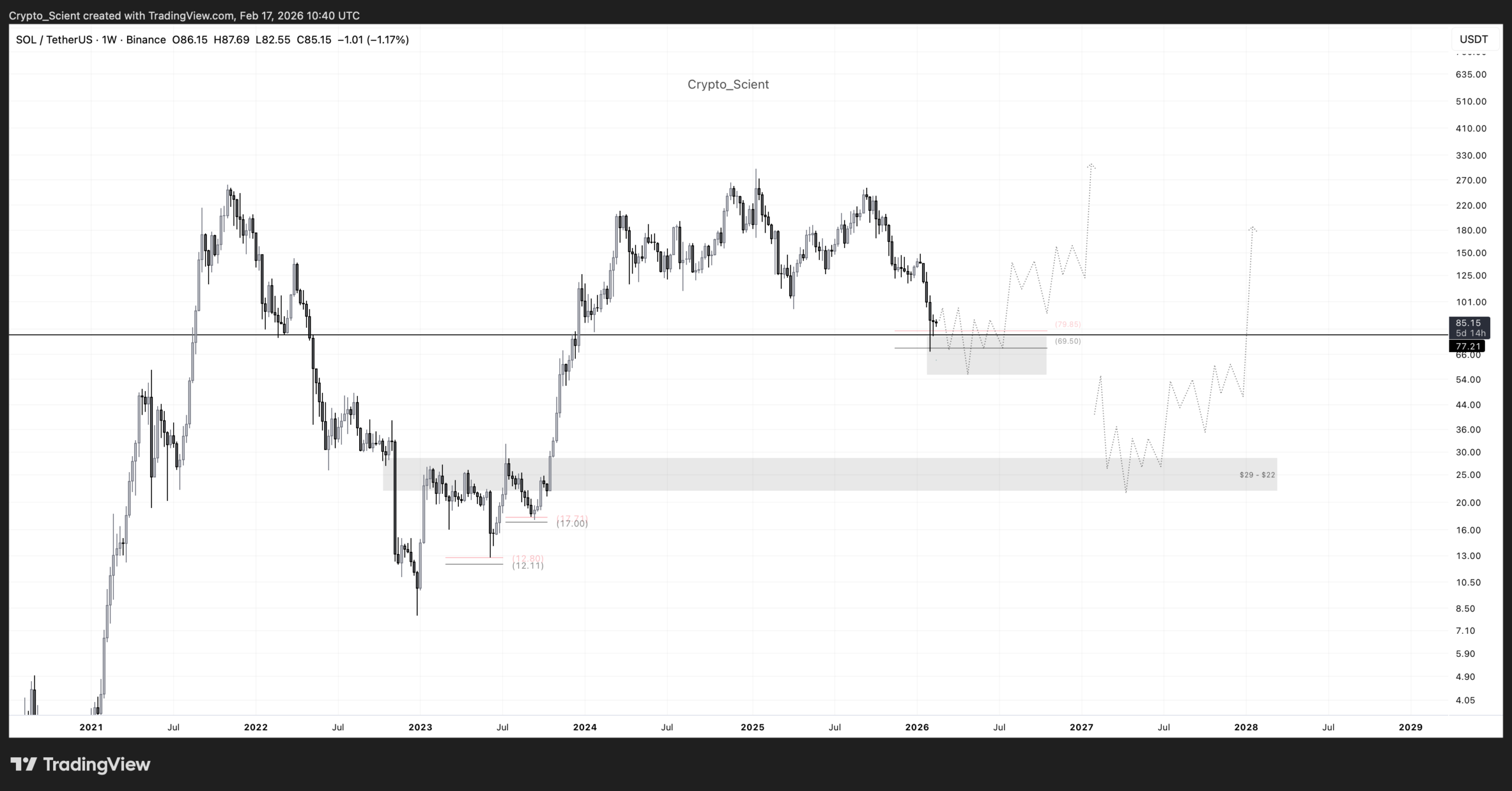 Crypto trader Scient noted two macro areas that may shape a potential bottom. The first is the 0.75 Fibonacci retracement zone of $60 to $70, a level associated with deeper pullbacks within larger uptrends.