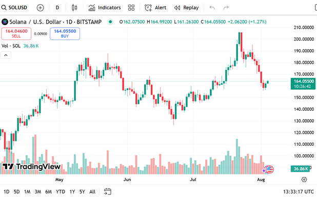 Whereas Solana futures experienced firework activity, the spot market is a different experience. SOL is currently priced at $163.51, 1.26% higher, with a market capitalization close to $88.04 billion. The daily trading volume, however, is 8.74% lower, reaching about $4.11 billion.