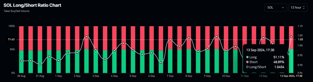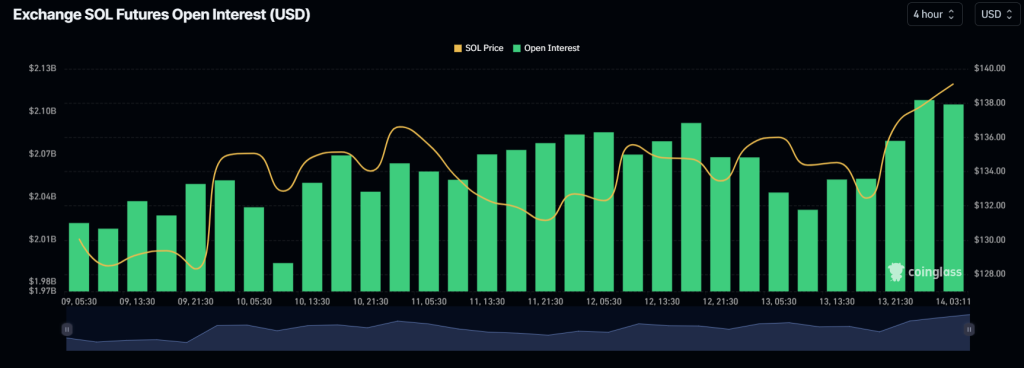Meanwhile, SOL’s future open interest has increased by 4.5% in the last 24 hours and has been steadily rising. This indicates that traders are betting more on long positions rather than short positions. Traders and investors often consider rising open interest and a long/short ratio above 1, while building long or short positions.