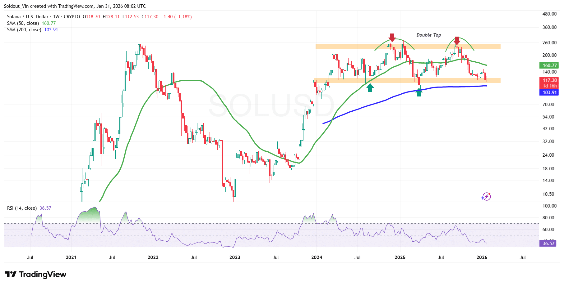 Solana price is trading within an intraday low of around $114.83 and a high of $118.61, just within the highlighted neckline of the double top pattern, which in most cases acts as a bearish sign.