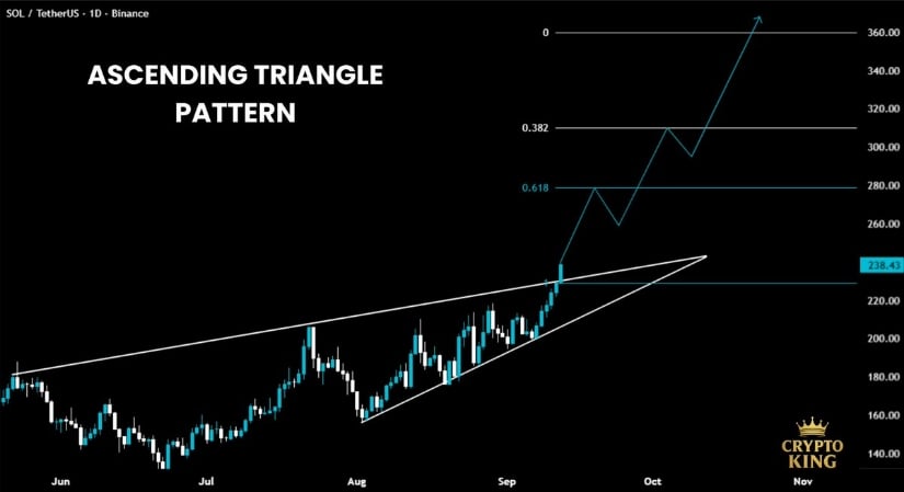 Solana has confirmed strength by breaking above an ascending triangle pattern. Analyst Crypto King highlights that this move signals fresh momentum, with price now opening the path towards higher Fibonacci levels. The breakout zone sits near $230 to $235, and holding above it would be crucial for sustaining the move.