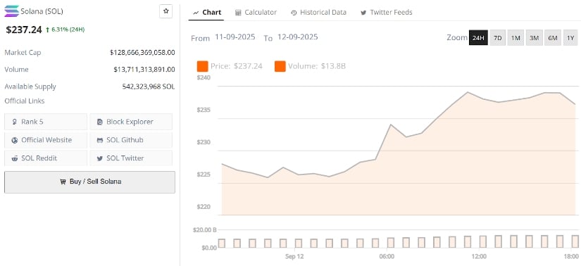 Solana is trading at around $237.24, up 6.31% in the last 24 hours. Source: Brave New Coin