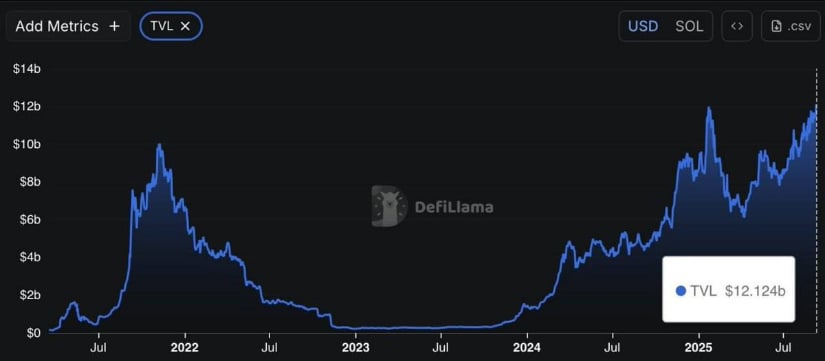 Solana has hit a record $12.1B in TVL, with strong price action calling for a potential breakout towards higher milestones.