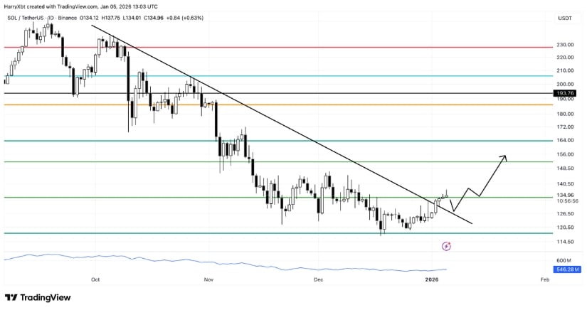 Adding to the bullish technical narrative, HarrySnipes pointed out that Solana price has broken above its descending trendline and is now attempting to confirm acceptance above $134 on a daily closing basis. His chart outlines a clear invalidation level below $130, while upside targets open toward the $150 region if price continues to hold above reclaimed support.
