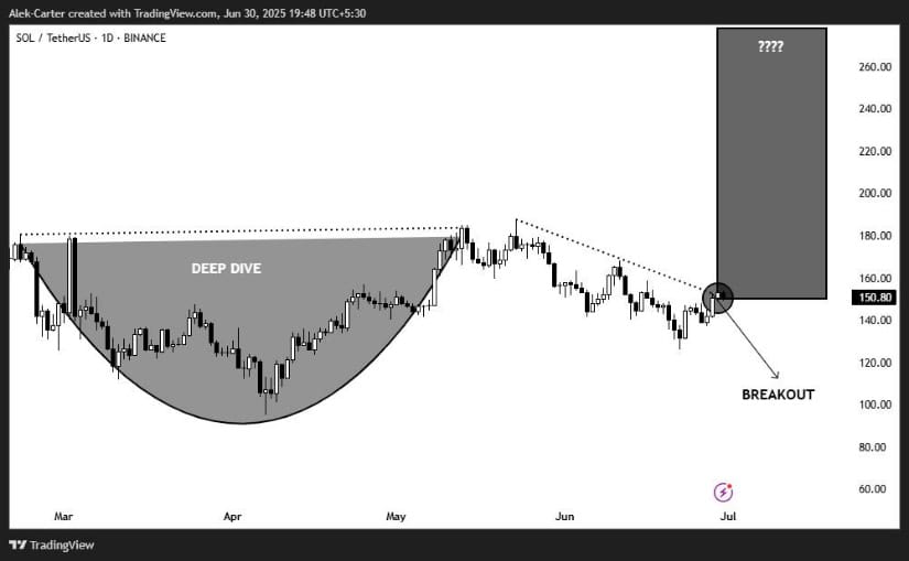 Alek Carter’s latest chart puts Solana in the spotlight with what looks like a textbook cup-and-handle formation finally breaking out. Solana has been in the limelight due to a potential ETF acceptance, now according to analyst Alek Carter, the price has been in the handle establishment, which is now reaching a potential breakout point.