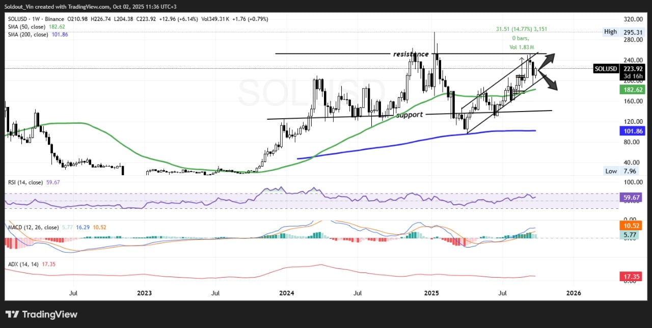 SOL price action has been marked by a series of higher highs and higher lows since a breakout in mid-2024. This is a strong technical sign that buyers are in control. Resistance remains strong at the $240 level, where the chart indicates previous selling pressure. But if SOL can break above that zone, analysts see targets at $252, and potentially higher if new buyers step in.