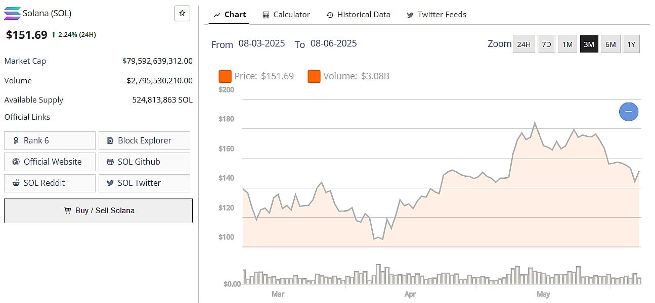 As of writing, SOL trades at $151.69—down 1.33%% over the past week but up 2.24% in the last 24 hours. With buying demand stable, Solana remains trapped below its 200-day Simple Moving Average (SMA) at $178.88 – reclaiming this level is crucial for a potential SOL bullish reversal