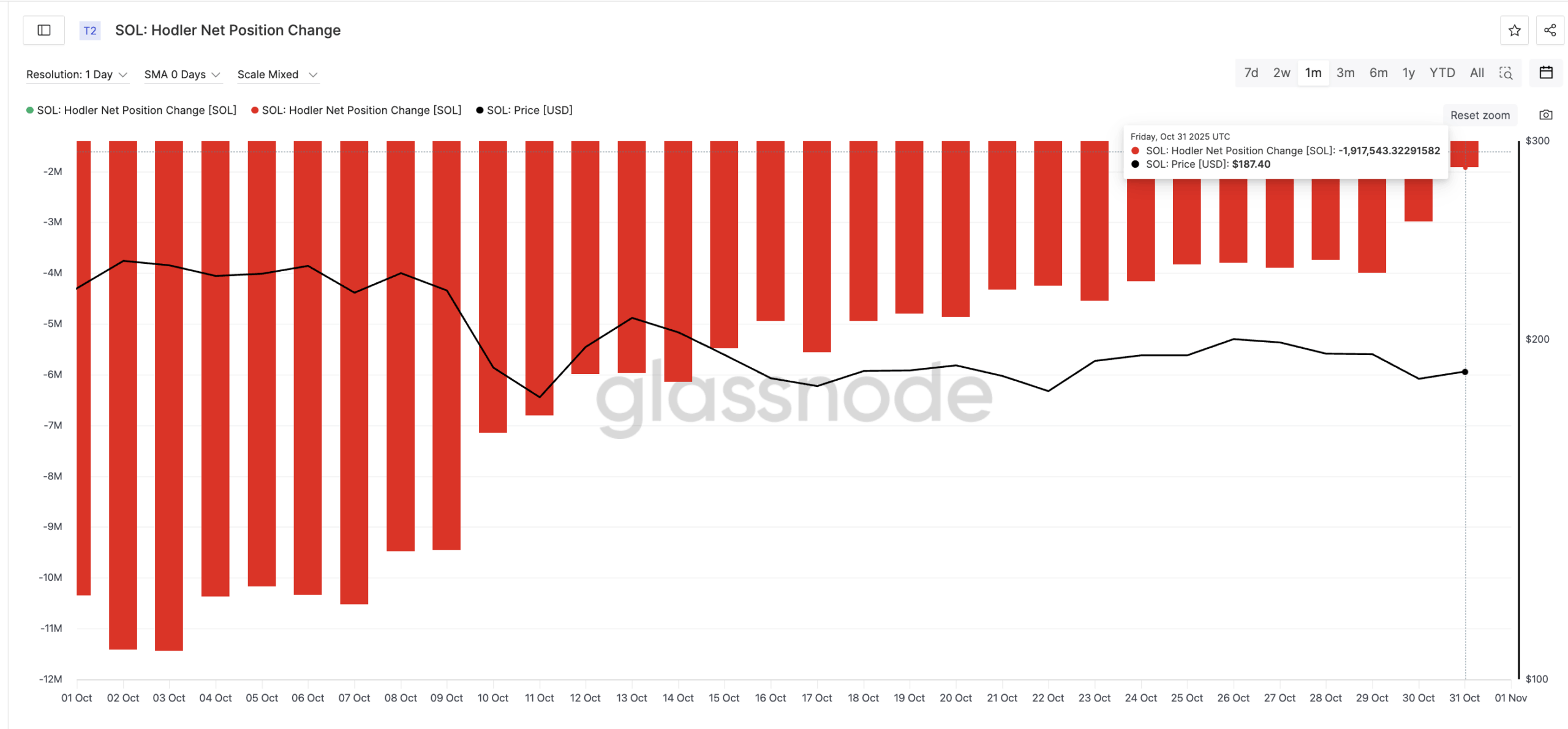 On October 3, net outflows peaked near –11.43 million SOL, one of the steepest levels this month. By October 31, that figure had improved to –1.91 million SOL, an 83% reduction in net outflows.