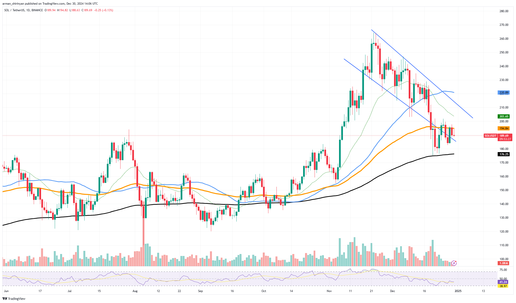 A common indicator of decreased market activity that may pave the way for a spike is Solana’s trading volume, which has dropped dramatically in recent sessions. In conjunction with the chart’s descending trendline resistance at about $203, SOL seems to be creating pressure that could be released by a significant upswing.