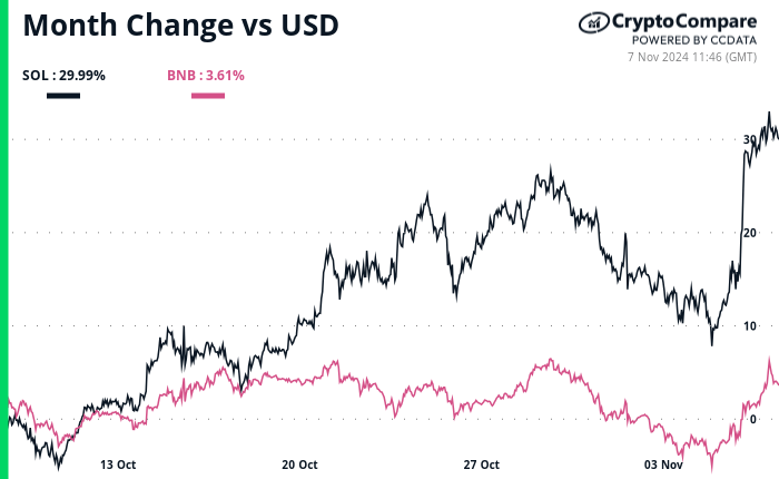 According to data from CryptoCompare, over the last 30-day period SOL’s price is up around 30% to now trade at around $187 per token, while Binance’s BNB saw an upward move of 3.6% to now stand at $594.