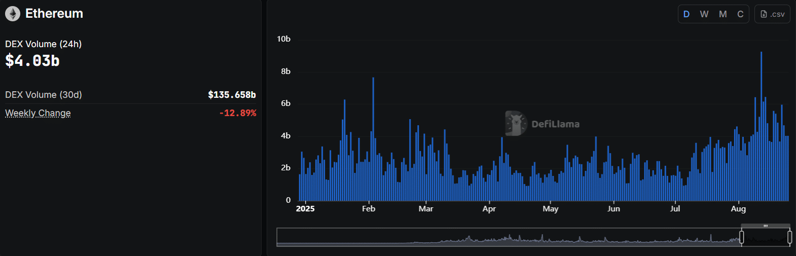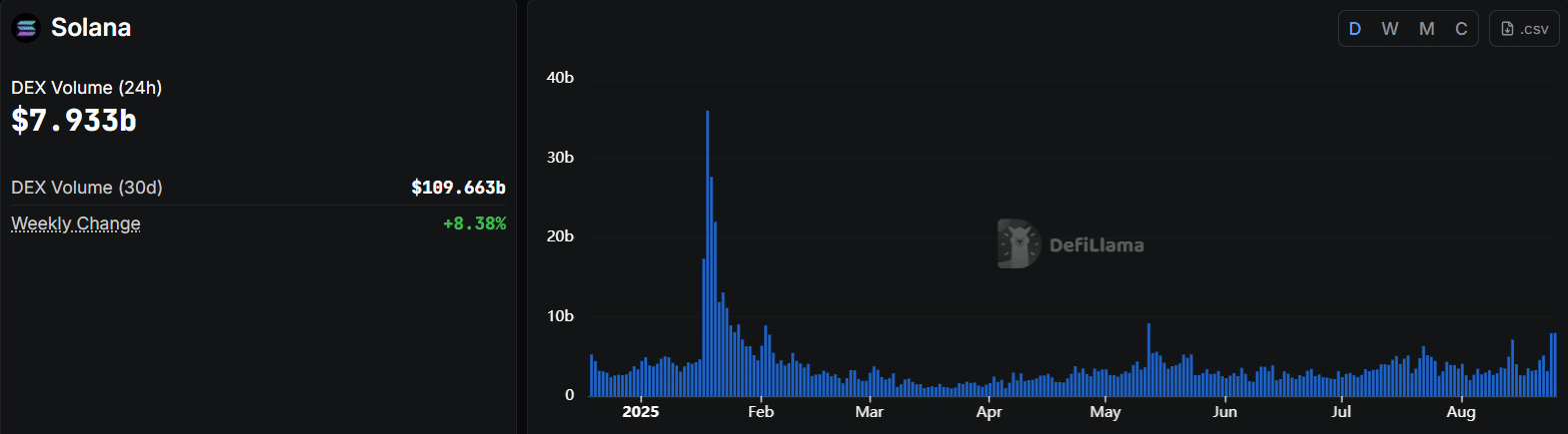 Solana’s daily DEX volume hit $7.93 billion, nearly doubling Ethereum’s $4.03 billion, with SOL posting an 8% weekly gain while ETH volumes slipped almost 13%.