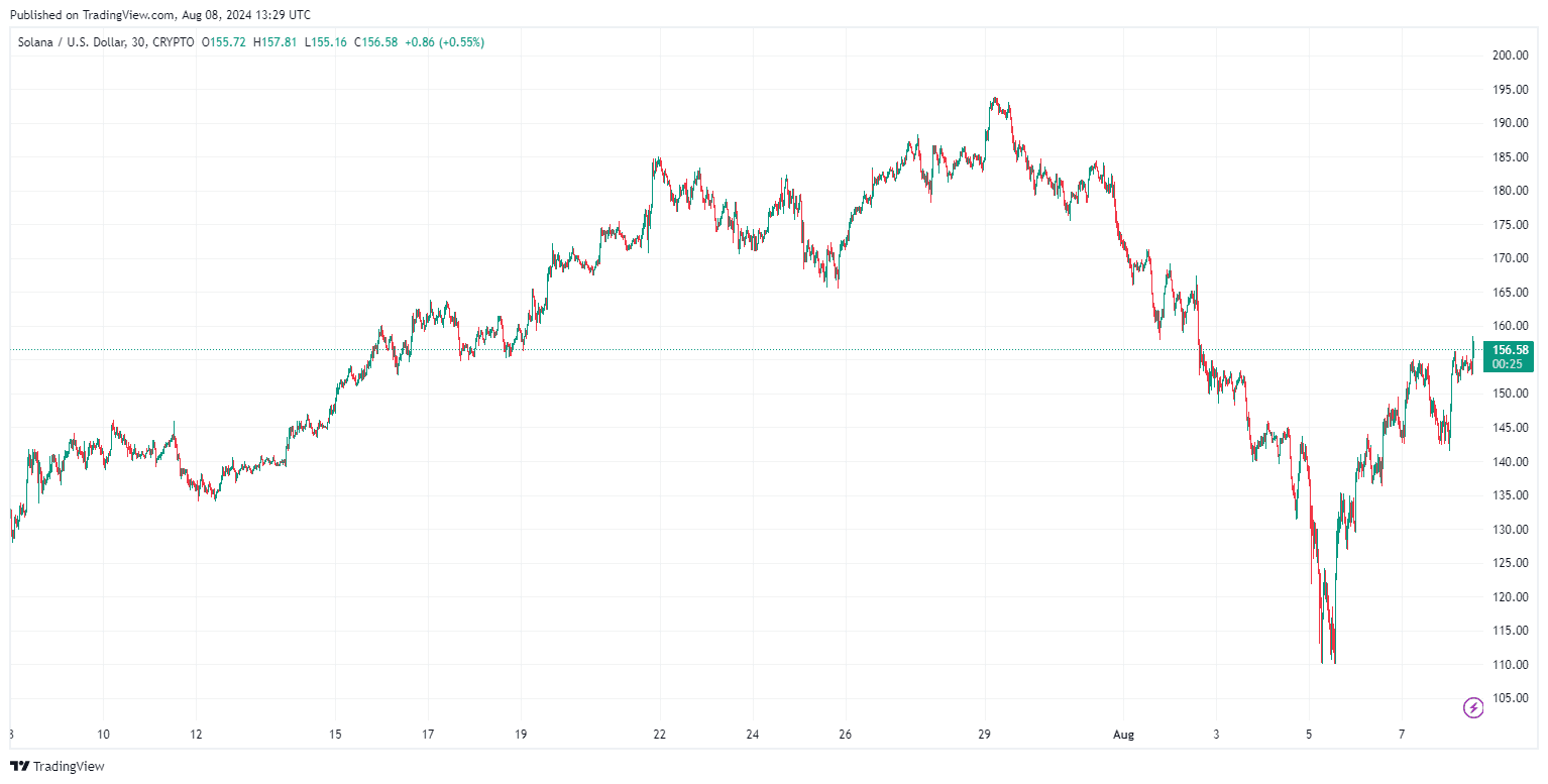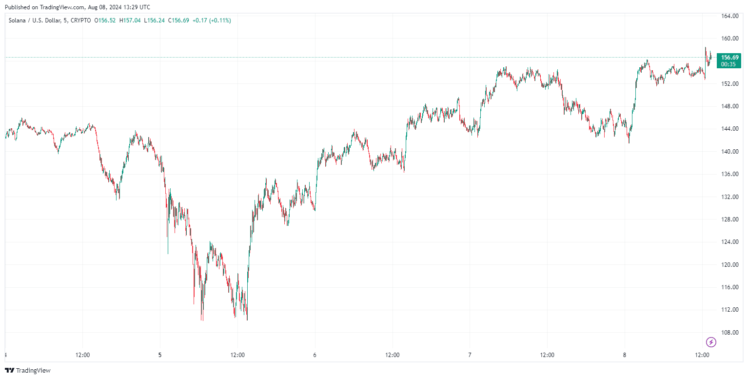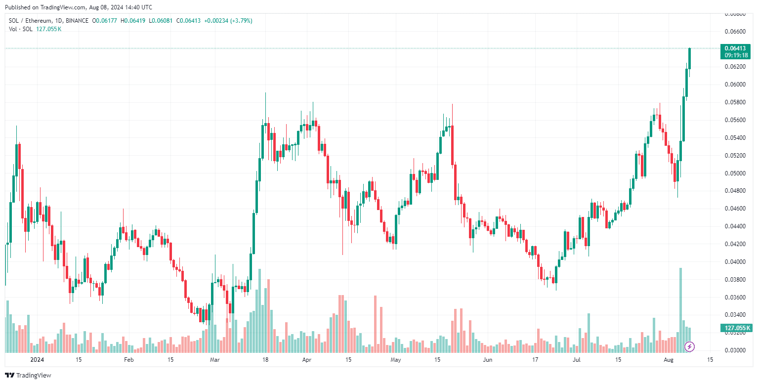 Dieser Anstieg unterstreicht Solanas Widerstandsfähigkeit und starke Fundamentaldaten, die erhebliches Interesse von Investoren geweckt haben. Laut TradingView verzeichnete SOL eine erhebliche Kurssteigerung, wobei das SOL/ETH-Verhältnis neue Höchststände erreichte.
