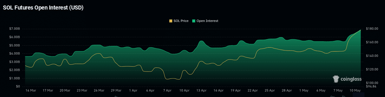 Solana’s Open Interest (OI) in Futures contracts climbed to over $6.8 billion, the highest level since mid-March. This marked a strong resurgence in speculative activity.