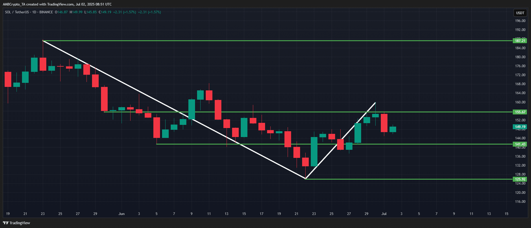 Solana [SOL] closed June down just 1.2% from its $156 monthly open. However, beneath that modest decline lies a structurally weak price action.