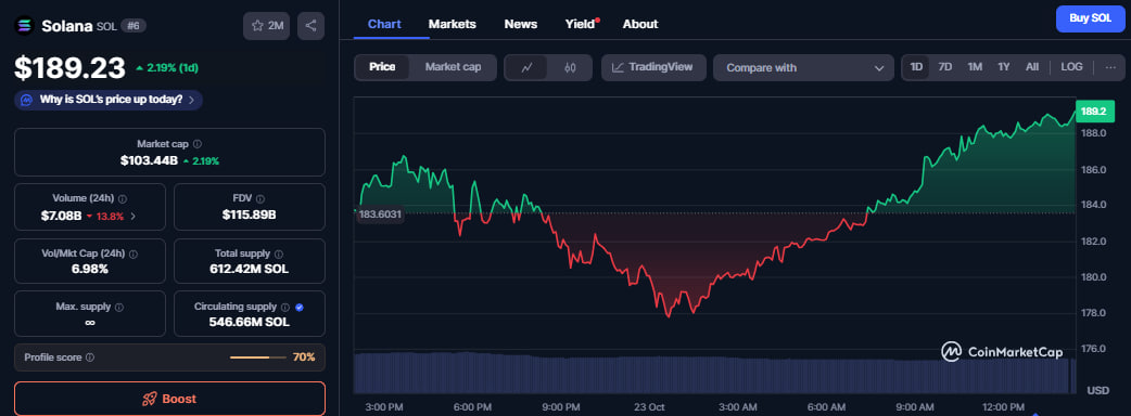 Solana is trading at $189. It has lost nearly 15% of its value in the past month as broader market bearishness outweighed optimism surrounding the tokenization updates.