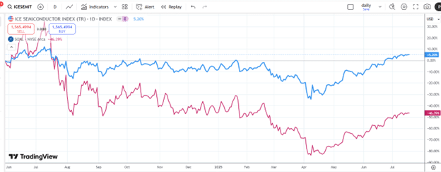 Why is the SOXL (red line) underperforming the ICESEMIT (blue line)?