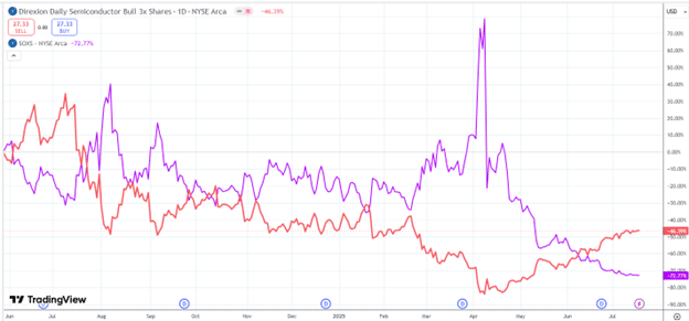 SOXS is the inverse. If the index declines by 1% in a day, SOXS is designed to increase by 3%. If the index increases by 1%, SOXS may decrease by 3%.