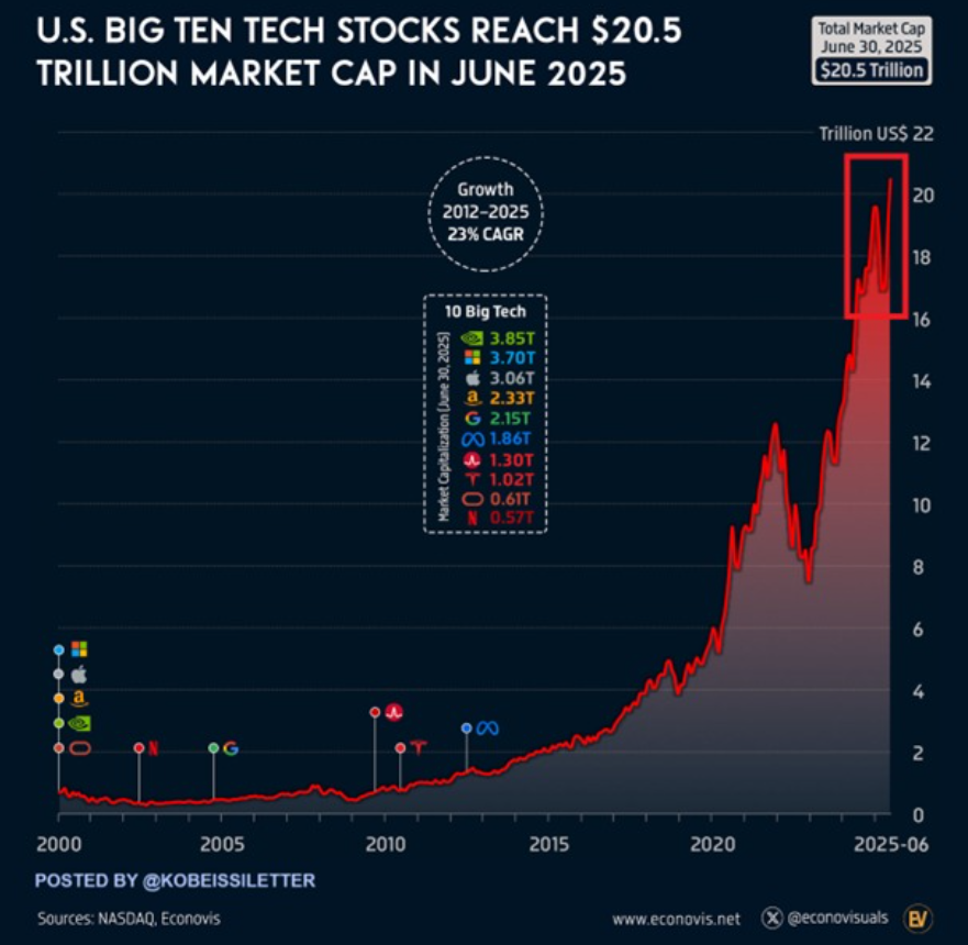 The top 10 tech stocks reached a record market value of $20.5 trillion in June. Just 3 stocks, Nvidia, $NVDA, Microsoft, $MSFT, and Apple, $AAPL, reflect half of that total.