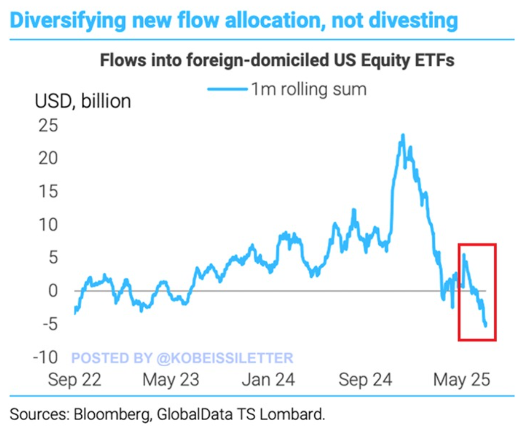 The surprise for many in regard to the US stock market comes from the fact that foreign investors appear to be diversifying out of US stocks in 2025. Investors from overseas withdrew $5 billion from US equity ETFs over the last month, the largest outflow in at least 3 years.