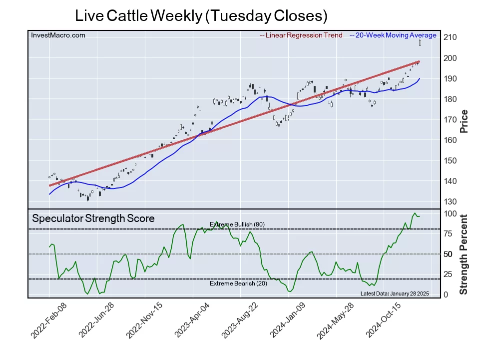 The Live Cattle speculator position comes in third this week in the extreme standings. The Live Cattle speculator level resides at a 95.9 percent score of its 3-year range.