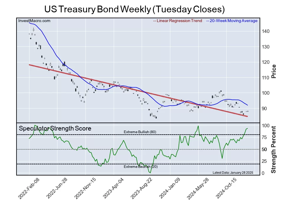 The US Treasury Bond speculator position rounds out the top five in this week’s bullish extreme standings. The US Treasury Bond speculator level sits at a 93.5 percent score of its 3-year range. The six-week trend for the speculator strength score was 26.1 this week.