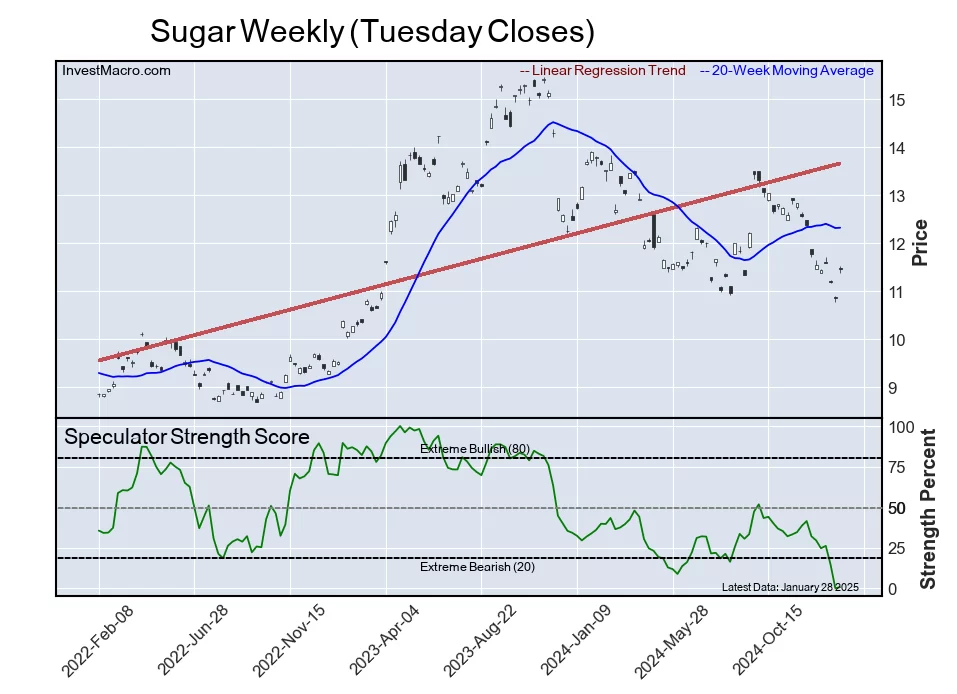The six-week trend for the speculator strength score was -0.3 this week. The overall speculator position was -66,604 net contracts this week with a decline of -4,118 contracts in the speculator bets.