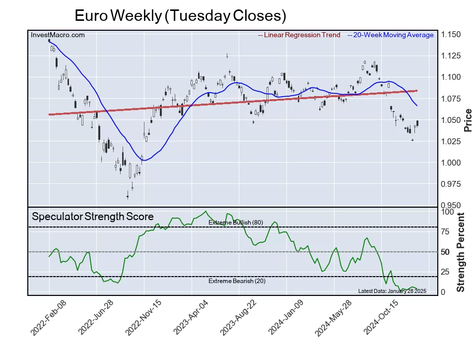 The six-week trend for the speculator strength score was -9.3 this week. The speculator position was -91,111 net contracts this week with a drop by -18,102 contracts in the weekly speculator bets.