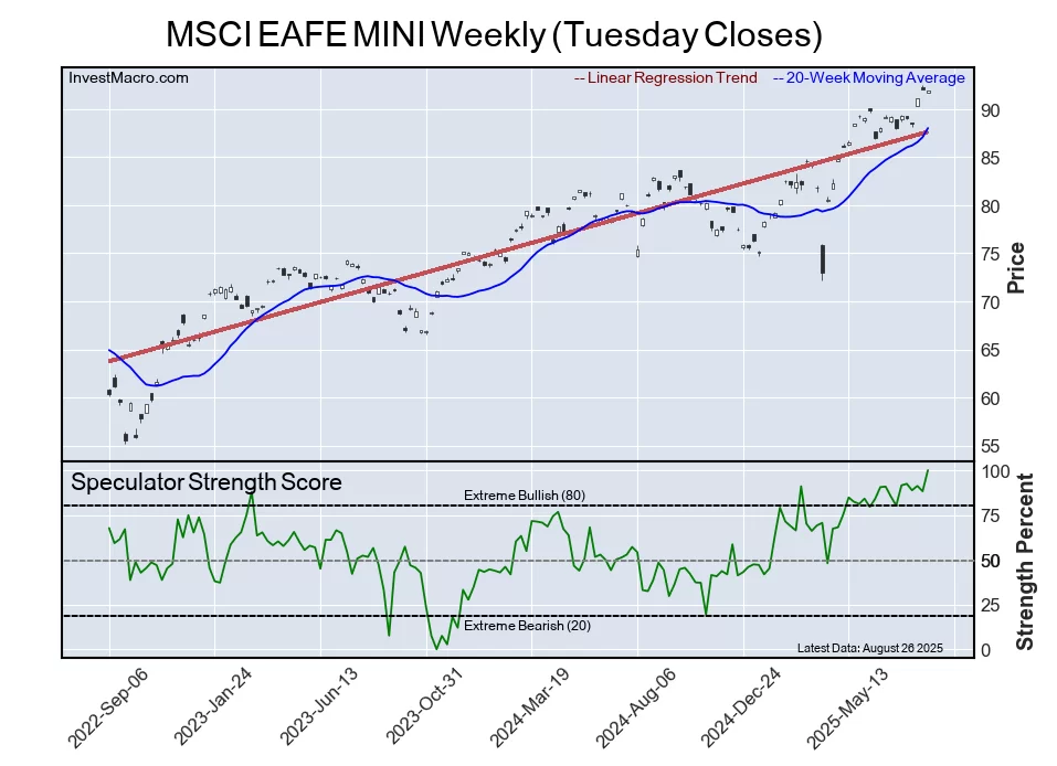 The MSCI EAFE MINI speculator position once again comes in as the most bullish extreme standing this week as the MSCI EAFE-Mini speculator level has advanced to a maximum 100 percent score of its 3-year range.
