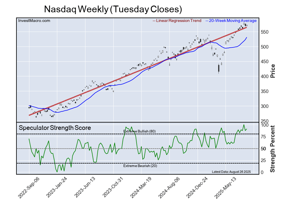 The six-week trend for the speculator strength score was -70 percentage points this week. The overall speculator position was -393,823 net contracts this week with a drop of -76,769 contracts in the speculator bets.