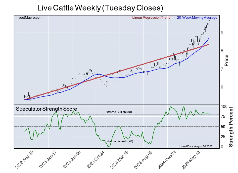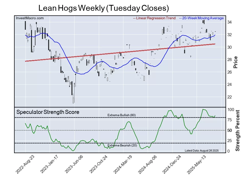 The Live Cattle speculator position comes next in this week’s bullish extreme standings. The Live Cattle speculator level is at a 83 percent score of its 3-year range. The six-week trend for the speculator strength score was a gain of 2 percentage points this week.