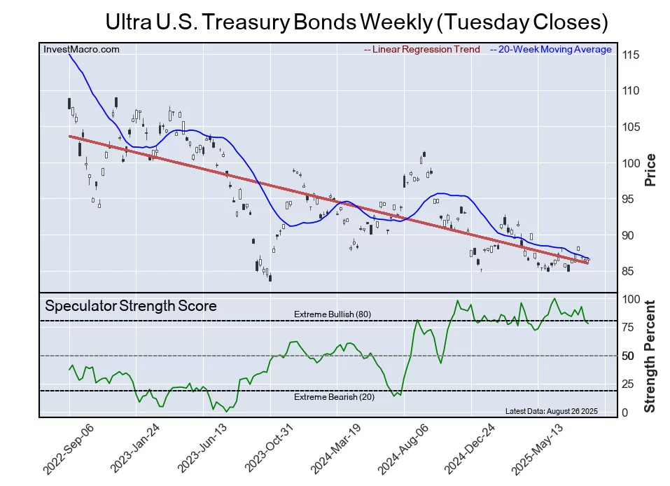 The Ultra U.S. Treasury Bonds speculator position rounds out the top five in this week’s bullish extreme standings. The Ultra Long T-Bond speculator level sits at a 78 percent score of its 3-year range. The six-week trend for the speculator strength score was a dip by -8 percentage points.