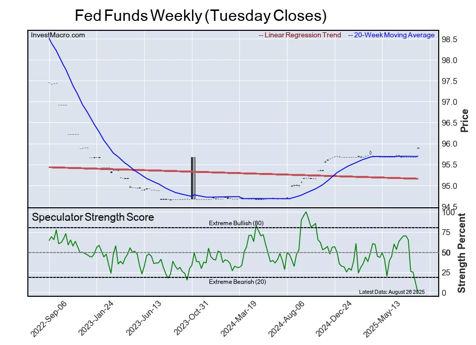 The Fed Funds speculator position comes in tied as the most bearish extreme standing this week with the FedFunds speculator level sitting at a minimum 0 percent score of its 3-year range.