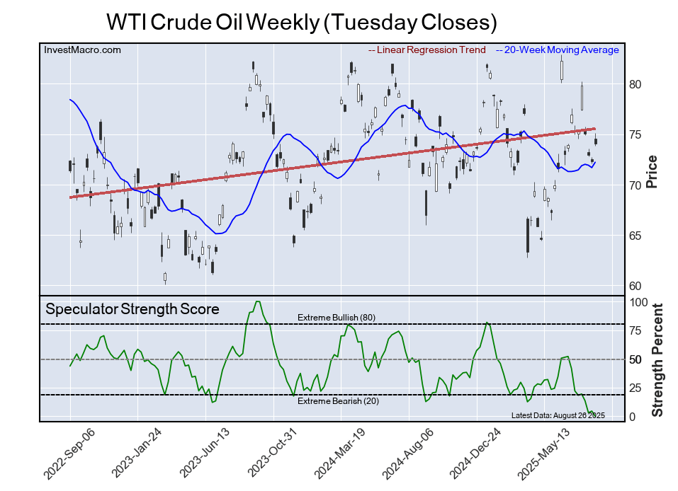 The six-week trend for the speculator strength score was a dip by -6 percentage points this week. The overall speculator position was -74,738 net contracts this week with a change of -4,445 contracts in the speculator bets.